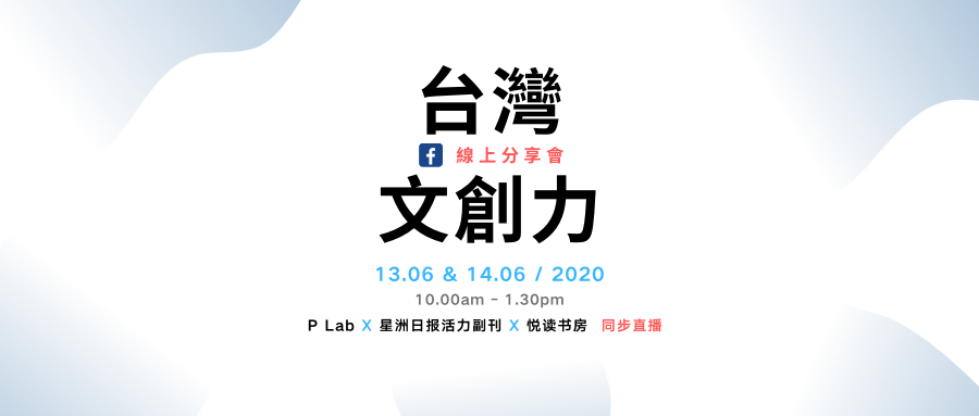 这场名为“台湾文创力”的线上系列分享会,由P Lab和星洲日报《活力副刊》联办,将在P Lab、活力副刊、悦读书房三个脸书专页同步直播,由P Lab创办人卓衍豪主持,欢迎对文创产业、民宿经营、观光旅游、商品设计、场域活化、品牌塑造等领域有兴趣的朋友参与。